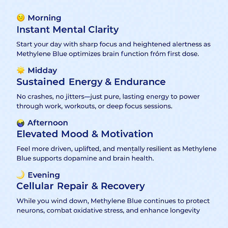 Methylene Blue works deep within your cells to elevate energy production, mental clarity, mood, and resilience. From sharper focus in the morning to cellular repair at night, it supports optimal brain and body function every step of the way.