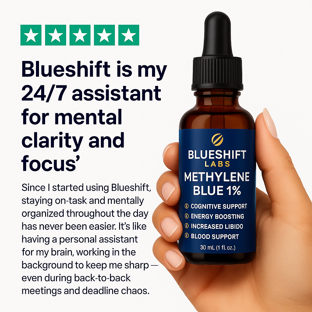 Ultimate Methylene Blue from BlueShift is enhanced with Nano Liquid Gold, which significantly improves absorption and cellular delivery. That means you actually feel the benefits—sharper focus, cleaner energy, and better results—compared to standard formulas that often pass through the body with minimal effect.